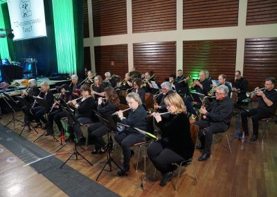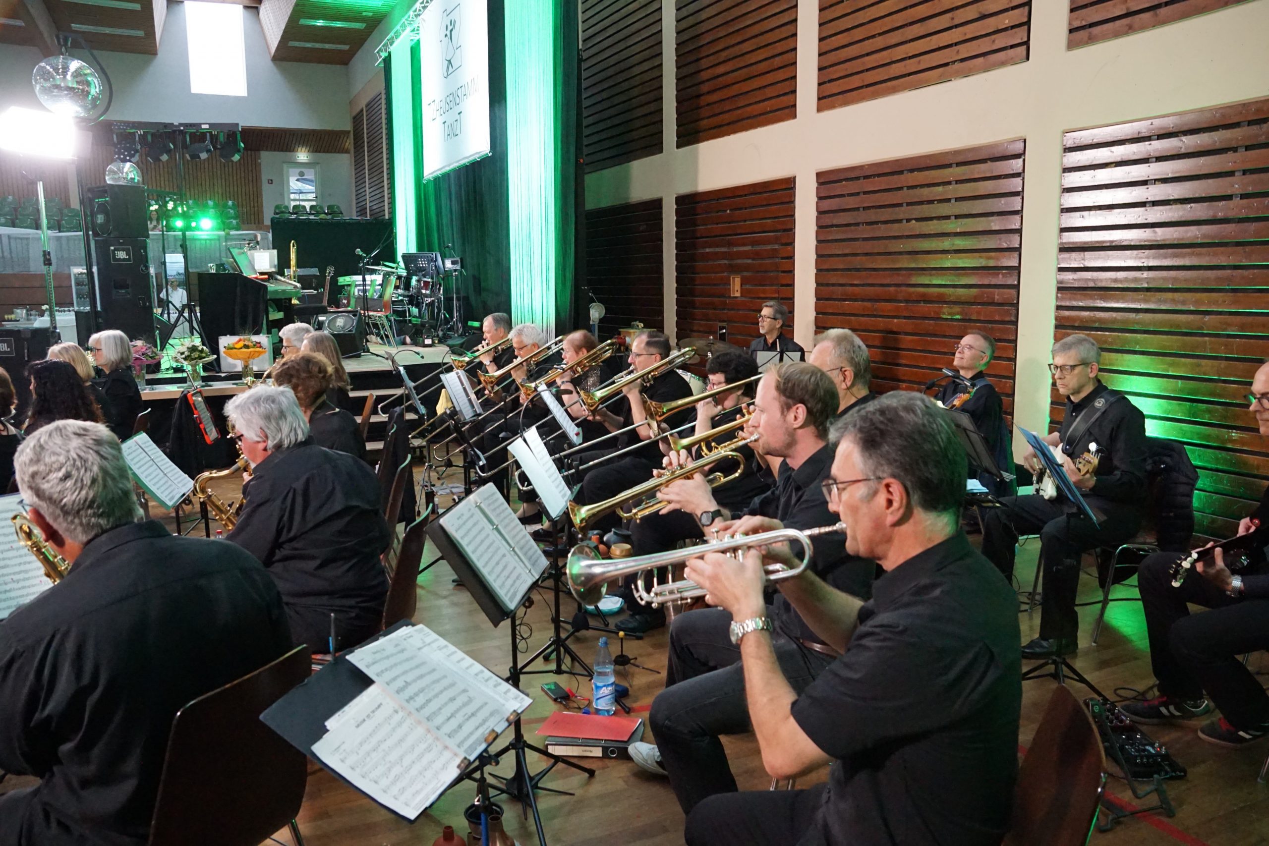 Die angenehme Atmosphäre und der freundliche Empfang ließen uns leicht und entspannt unsere sieben Musikstücke spielen. Wir haben einen guten Auftritt „hingelegt“ und konnten mit der Qualität der nachfolgenden Tanzkapelle Michael Holz ebenbürtig mithalten. Und das fast gänzlich unverstärkt (bis auf E-Bass, Gitarre und Piano, die von unserer Ex-Vorsitzenden Marion Bax liebevoll „die Elektriker“ genannt werden).