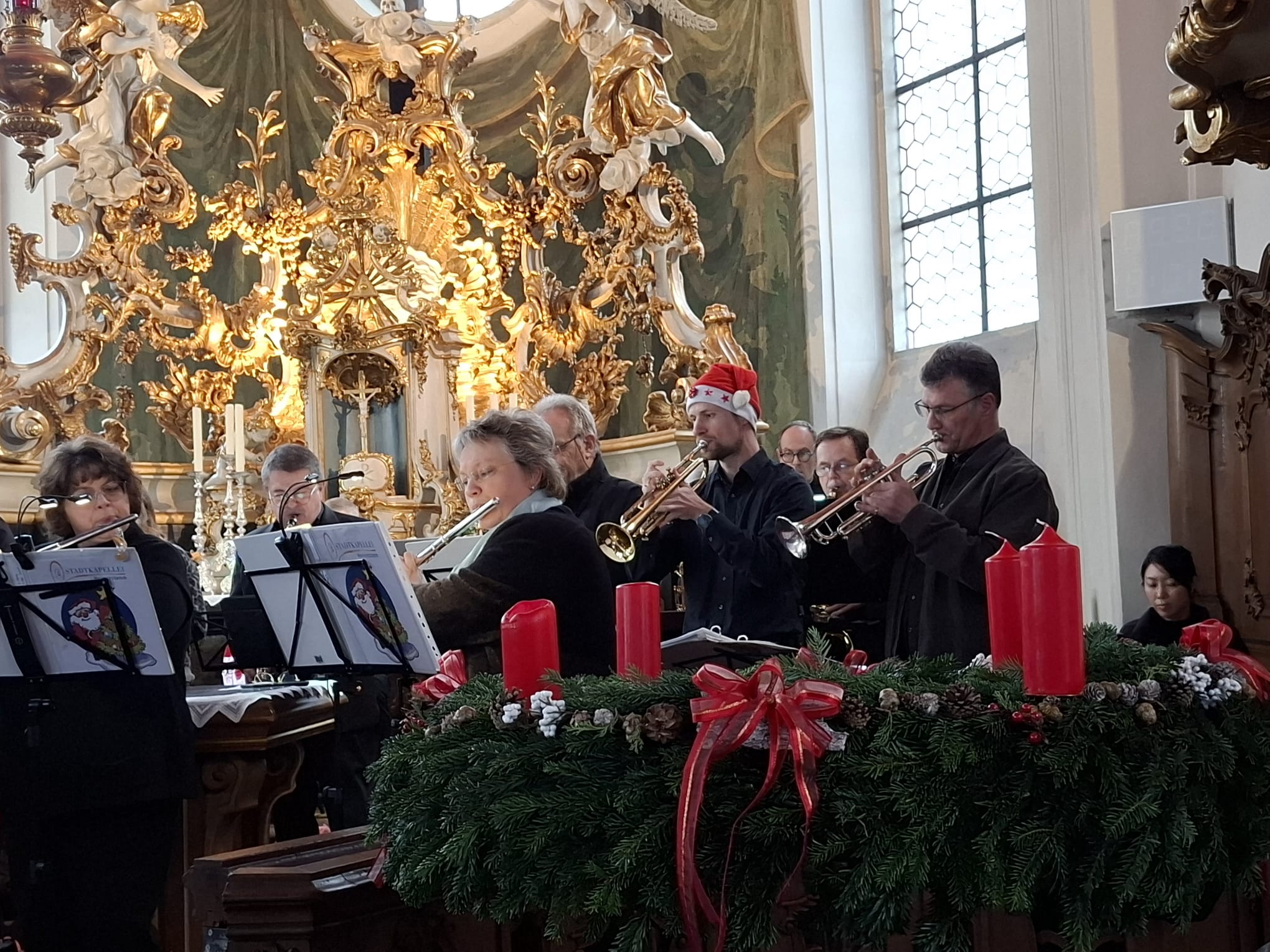 Am Sonntag, den 7. Dezember spielte die Stadtkapelle Heusenstamm erstmals in der barocken Kirche St. Cäcilia und nicht, wie die Jahre davor, im Torbogen auf dem Vorplatz. Ganz unter dem Motto „Swinging Christmas“ präsentierte die Stadtkapelle eine Mischung aus traditionellen Weihnachtsliedern wie „Oh du fröhliche“ und „Süßer die Glocken nie klingen“, aber auch jazzig-swingende Arrangements bekannter Weihnachtslieder. Die Kombination des vielfältigen Programms kam hörbar gut an, da man einige Köpfe im Takt mitwippen sah und viele Zuhörerinnen und Zuhörer motiviert mitsangen.