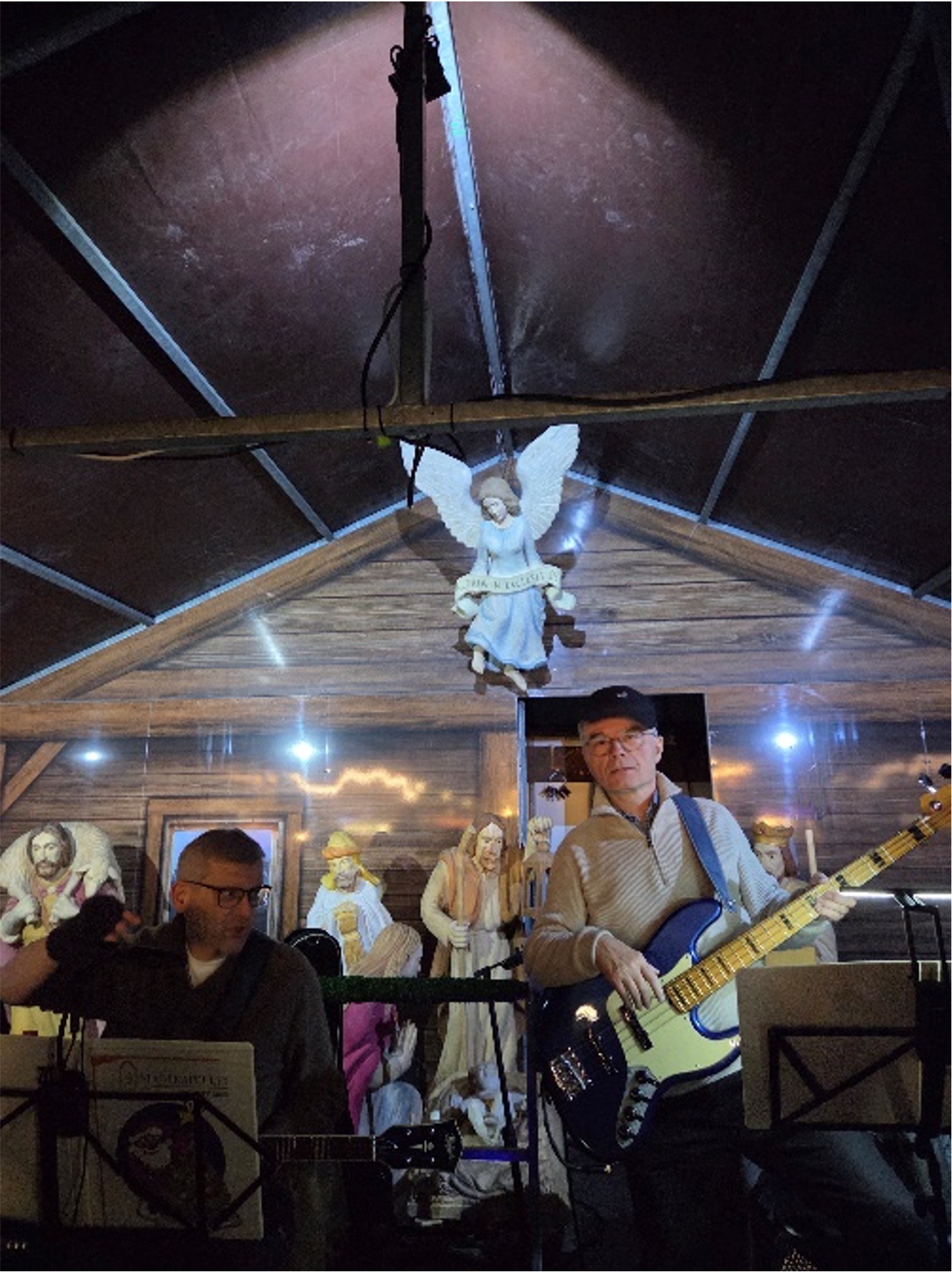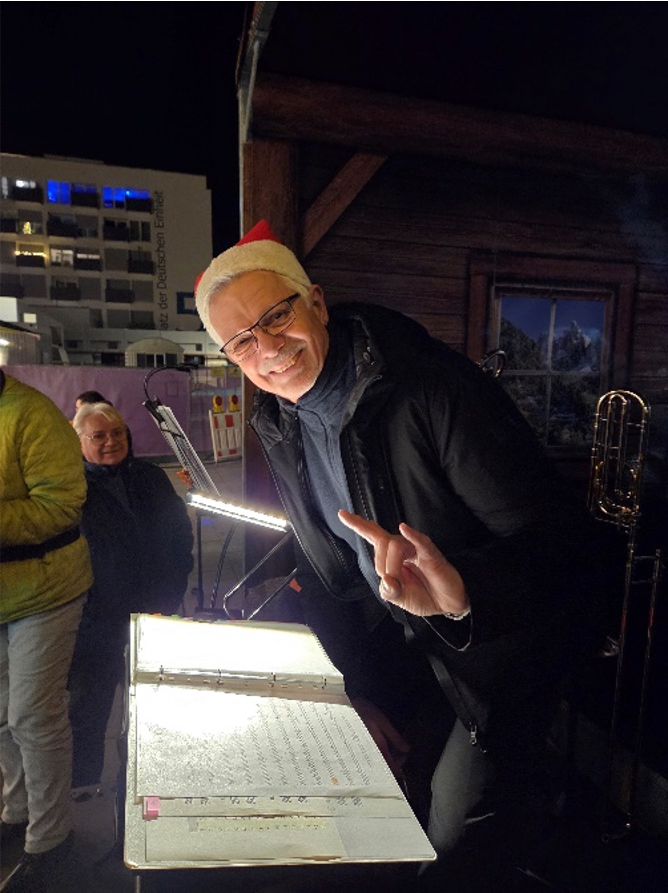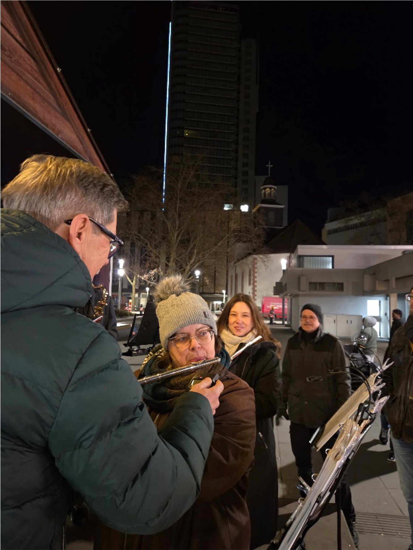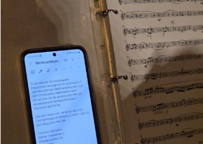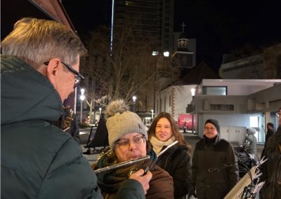 Wie jedes Jahr haben wir uns dick eingemümmelt vor der Krippe am Rathaus getroffen und erstmal unsere Notenständer / Noten / Finger etc. sortiert….