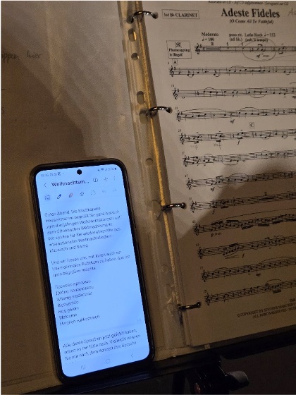 Hier zeigte sich schnell, wie man kreativ auch ohne Notenständer eine Lösung finden kann – Wolfgang hat es vorgemacht, es geht auch mit diversen Instrumentenkoffern.